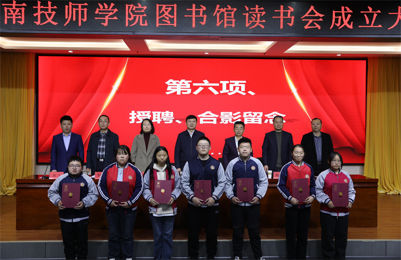 會(huì)上,圖書館館長(zhǎng)李海波介紹了讀書會(huì)成立的背景,宣讀《讀書會(huì)章程》總則,院團(tuán)委書記楊曉琪宣讀成立批復(fù)文件及干部聘任名單。經(jīng)過(guò)前期公開(kāi)競(jìng)聘與嚴(yán)格評(píng)審,選拔出了讀書會(huì)管理人員,與會(huì)領(lǐng)導(dǎo)為受聘學(xué)生頒發(fā)了聘書并合影留念。新任讀書會(huì)會(huì)長(zhǎng)陳德軒、會(huì)員代表劉秦嘉同學(xué)分別表態(tài)發(fā)言,承諾積極投身閱讀活動(dòng),履職盡責(zé),共同維護(hù)這一精神家園。