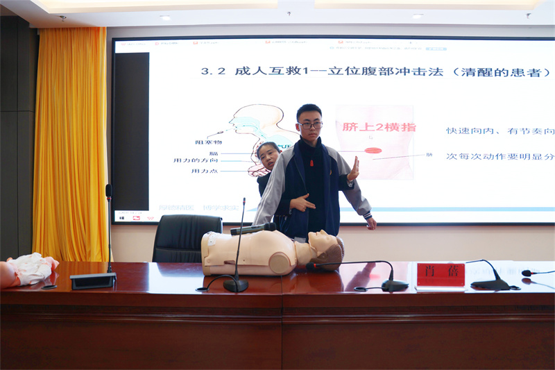 本次培訓(xùn)采用“理論精講+實(shí)操演練”的模式,以心肺復(fù)蘇(CPR)、自動(dòng)體外除顫器(AED)使用要點(diǎn)、海姆利克急救法為核心,深度解讀了“黃金四分鐘”等關(guān)鍵急救理念,幫助學(xué)生快速建立系統(tǒng)、科學(xué)的急救認(rèn)知框架。主講人借助模擬人體模型,全程示范心肺復(fù)蘇完整操作流程,每一個(gè)關(guān)鍵動(dòng)作均拆解講解、反復(fù)示范,確保要點(diǎn)清晰易懂、操作標(biāo)準(zhǔn)可辨。