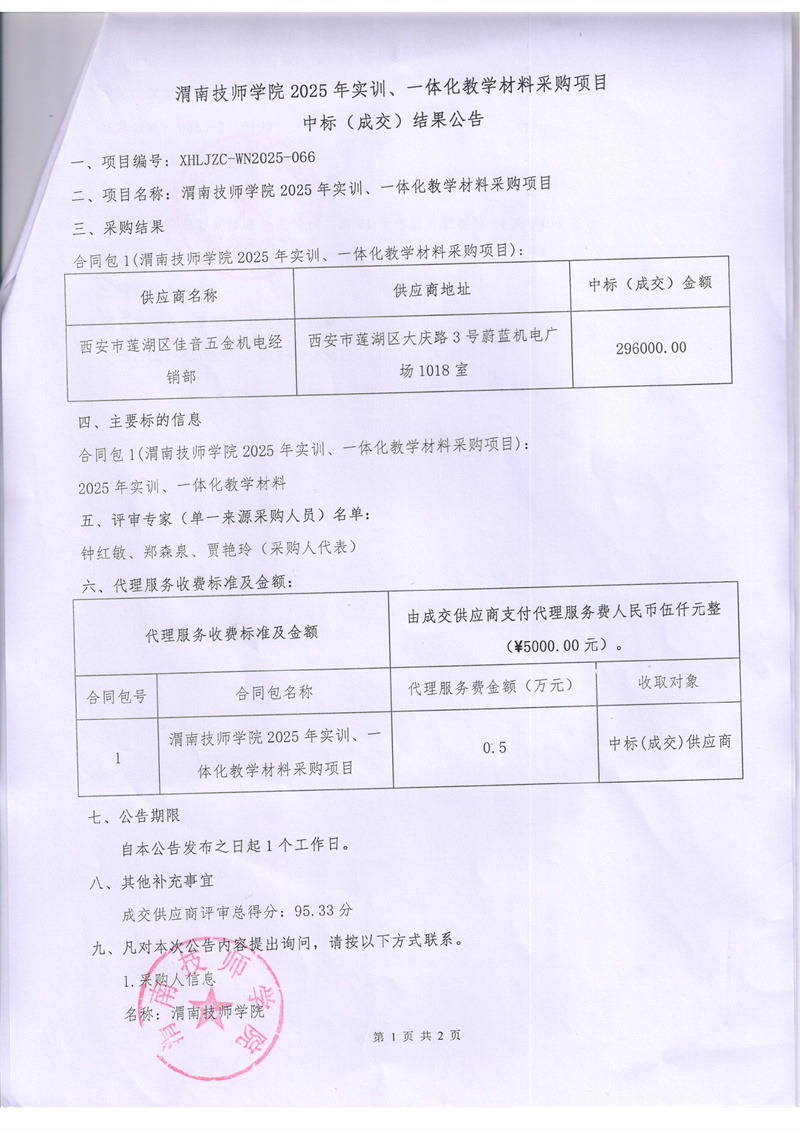 渭南技師學(xué)院2025年實(shí)訓(xùn)、一體化教學(xué)材料采購(gòu)項(xiàng)目中標(biāo)(成交)結(jié)果公告