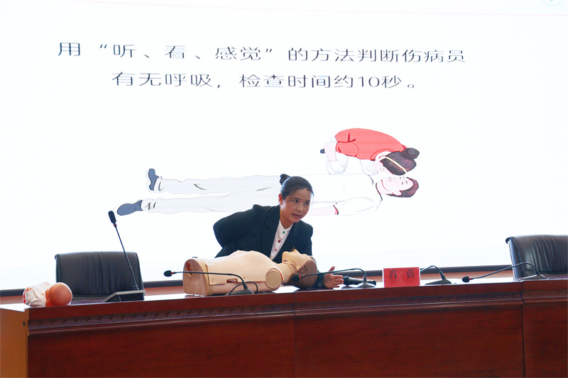 本次培訓(xùn)采用“理論精講+實(shí)操演練”的模式,以心肺復(fù)蘇(CPR)、自動(dòng)體外除顫器(AED)使用要點(diǎn)、海姆利克急救法為核心,深度解讀了“黃金四分鐘”等關(guān)鍵急救理念,幫助學(xué)生快速建立系統(tǒng)、科學(xué)的急救認(rèn)知框架。主講人借助模擬人體模型,全程示范心肺復(fù)蘇完整操作流程,每一個(gè)關(guān)鍵動(dòng)作均拆解講解、反復(fù)示范,確保要點(diǎn)清晰易懂、操作標(biāo)準(zhǔn)可辨。