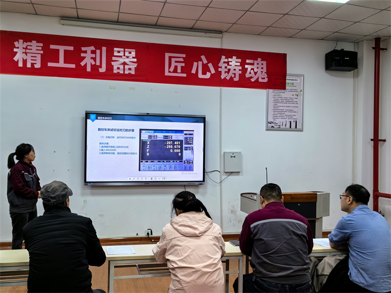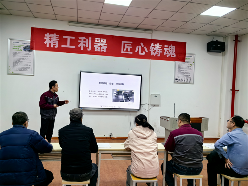 五位老師緊扣專業(yè)核心技能點與職業(yè)素養(yǎng)培養(yǎng)目標,依次完成15分鐘微型課展示,內容緊密對接崗位實際,體現(xiàn)“崗課賽證”融合的教學理念。周瑜老師講解了“車削外圓及端面”的關鍵步驟與操作要領,將傳統(tǒng)車床加工的精度與技巧生動呈現(xiàn);宜渭峰老師針對“數(shù)控車G00、G01指令”,系統(tǒng)闡釋了快速定位與直線插補的功能應用與實際編程案例;張海軍老師帶來的“數(shù)控銑對刀操作”,重點突出了對刀精度對于加工質量的決定性影響;賈艷玲老師同樣圍繞“數(shù)控車對刀操作”,從另一視角展示了其嚴謹?shù)牟僮髁鞒膛c常見問題解決方法;曹西安老師對“G41、G42半徑補償指令”進行了深入解析,破解了學生在程序編制中的難點。五位教師風格各異卻同樣精彩,展現(xiàn)了實訓教師 “懂技術、善教學、精指導”的專業(yè)素養(yǎng),彰顯了新時代實訓教學的創(chuàng)新活力。